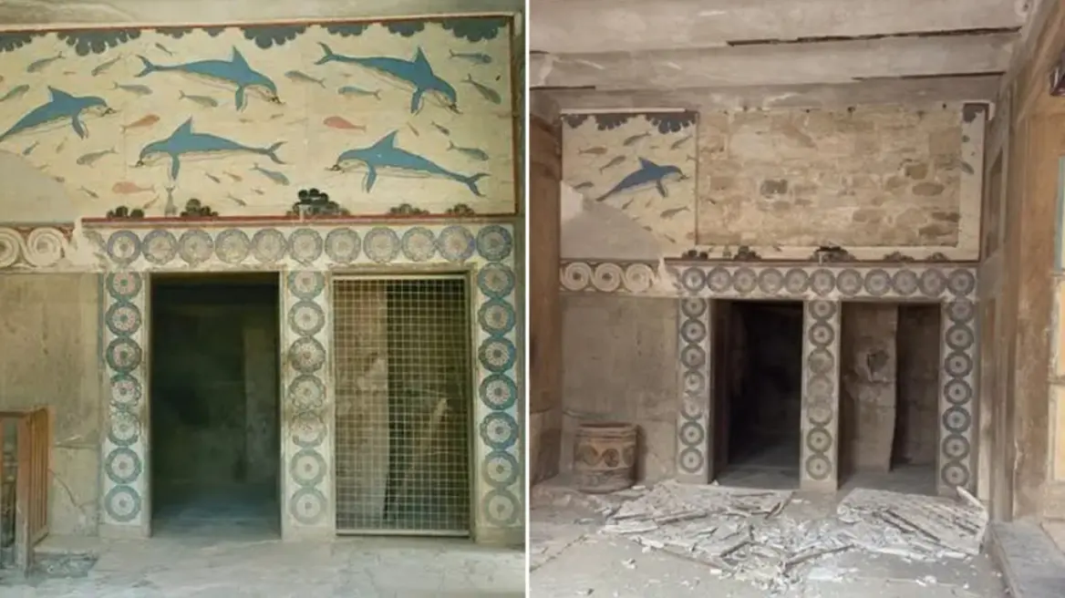 Копия "Настенной росписи с дельфинами", оставленная на месте оригинала в Кносском дворце (сам оригинал, датируемый около 1600 года до н. э., хранится в Археологическом Музее Ираклиона), до и после её обрушения при землетрясении:
